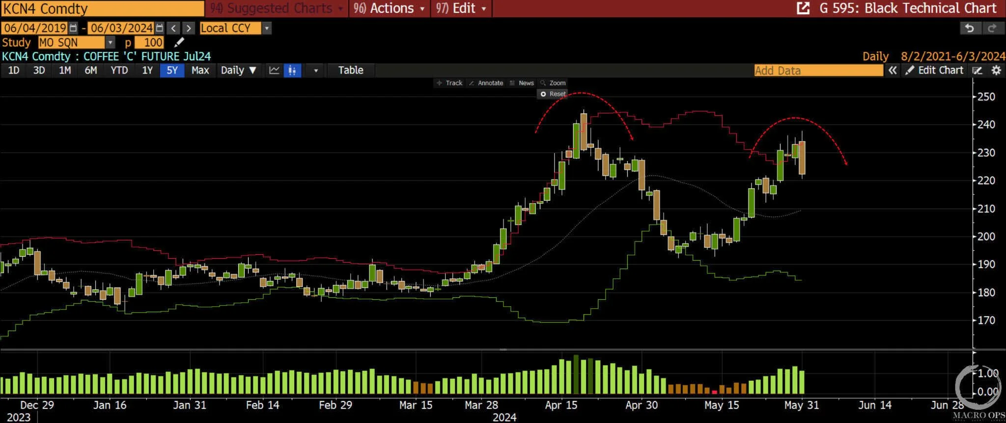 7. Coffee saw a big reversal bar at its upper band on Friday, giving us a double top on the weekly.