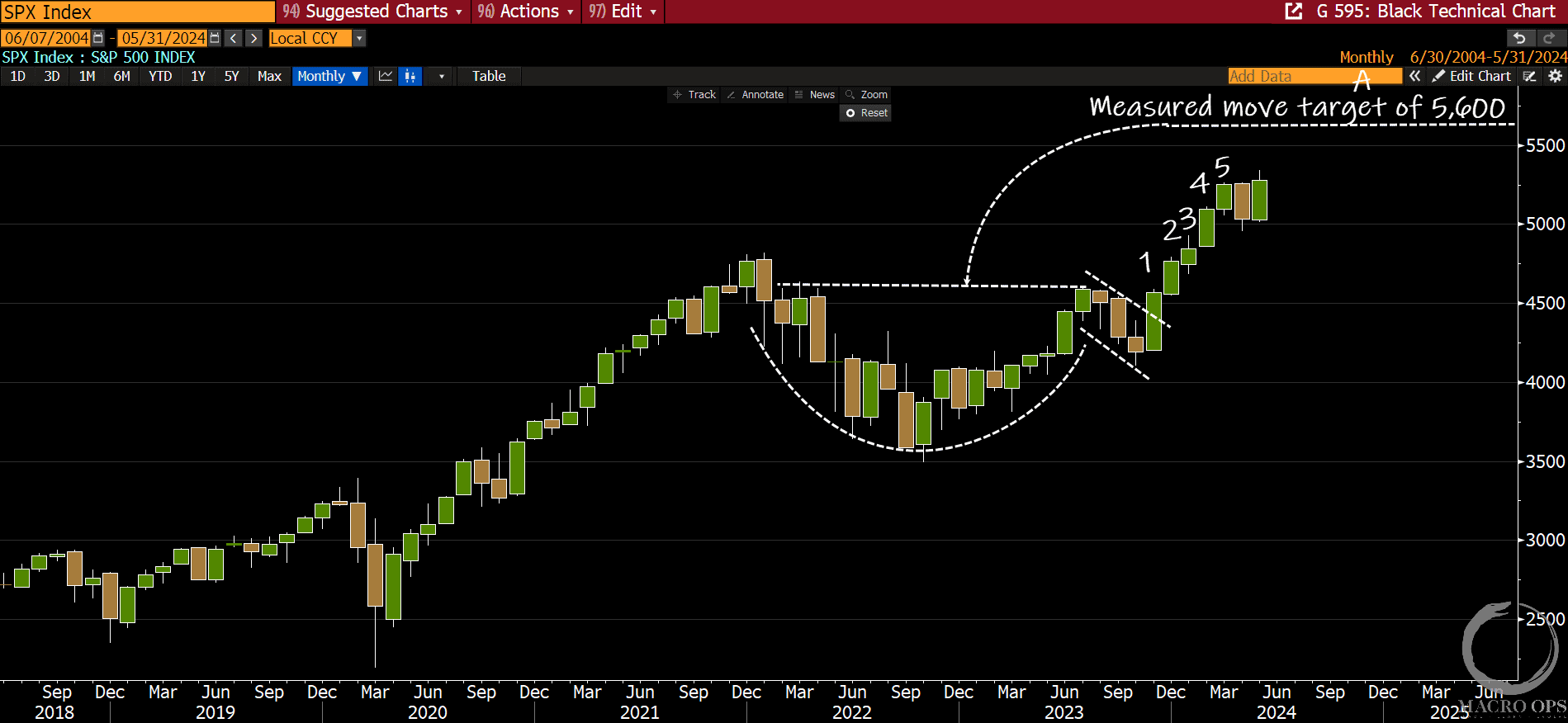 1. New monthly closing all-time high in the SPX. This follows a strong five-month consecutive bull bar breakout from a 2-year cup-n-handle pattern. Odds are that last month was the correction ending the first bull leg and we’re about to embark on the second one higher. The measured move target for the larger pattern is 5,600.