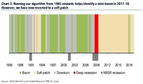 11) BofAML’s big-data machine-learning US Business Cycle Indicator shows that the US economy is moving away from a recession regime and into a “soft patch”.