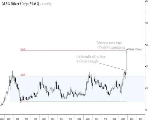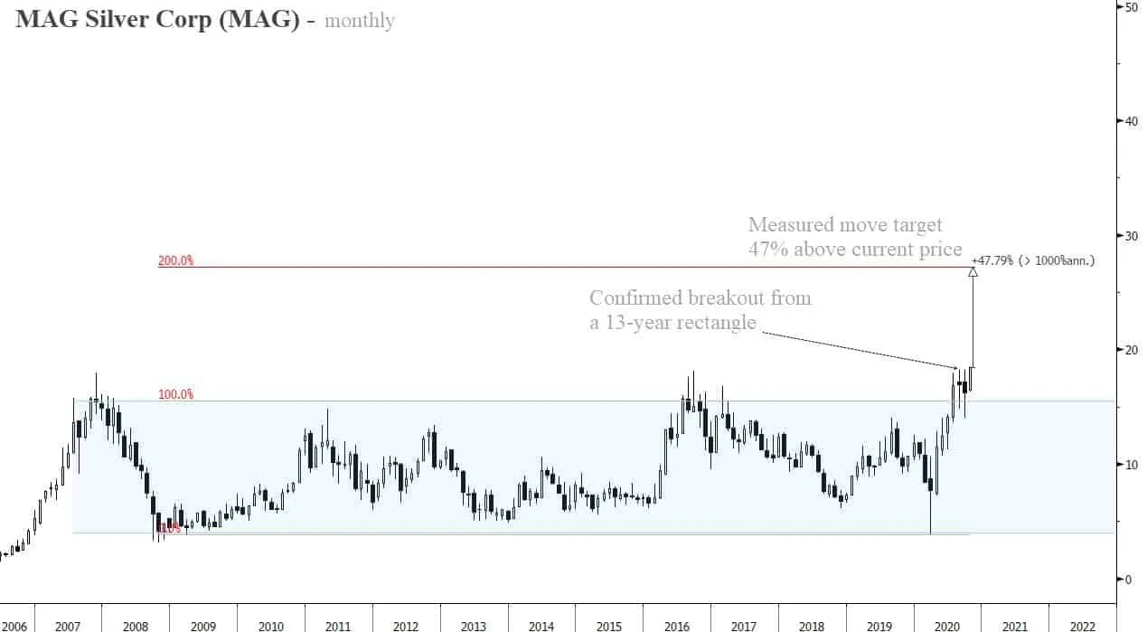 - MAG Silver Corp (MAG) has broken out of a 13-year rectangle base. The chart below is a monthly. The measured move target is just below $30 a share, which is roughly 50% above current prices. You can find our precious metals framework and long-term bull case here.