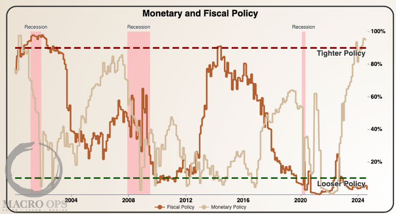 2. Tight monetary policy mixed with loose fiscal policy is what George Soros called the “Imperial Circle” when the Reagan administration ran a similar regime. This regime is typically marked by outperformance in the core vs. periphery (US vs. rest of the world) and a strong dollar. With the Fed now entering a cutting cycle, we will likely transition to a Vicious Circle soon.
