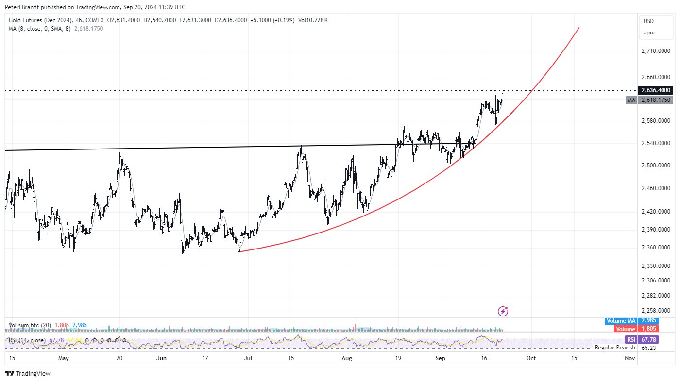 “As of current price action, it is possible to define Gold as having entered a parabolic advance (in red). It is an easy mistake to take profits prematurely in parabolic moves. Previous bull cycles of Bitcoin are cases in point.”