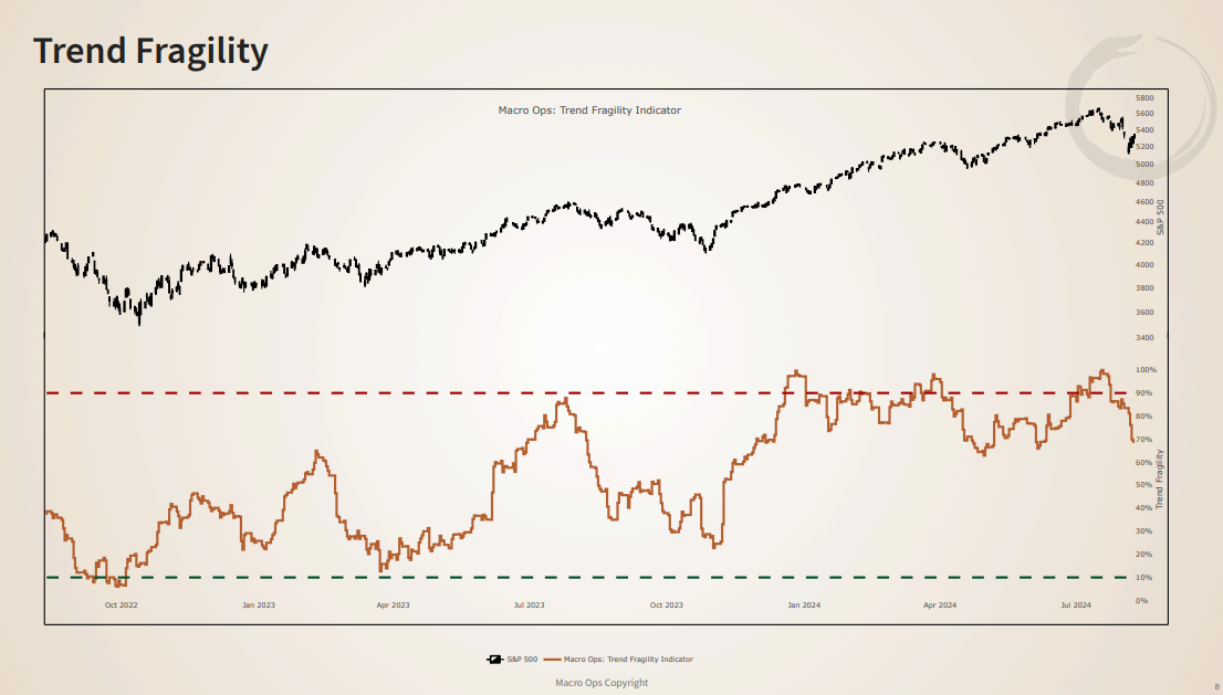 1. Our Trend Fragility indicator which hit 100% before the start of this selloff, has now fallen to slightly more neutral levels at 70%.