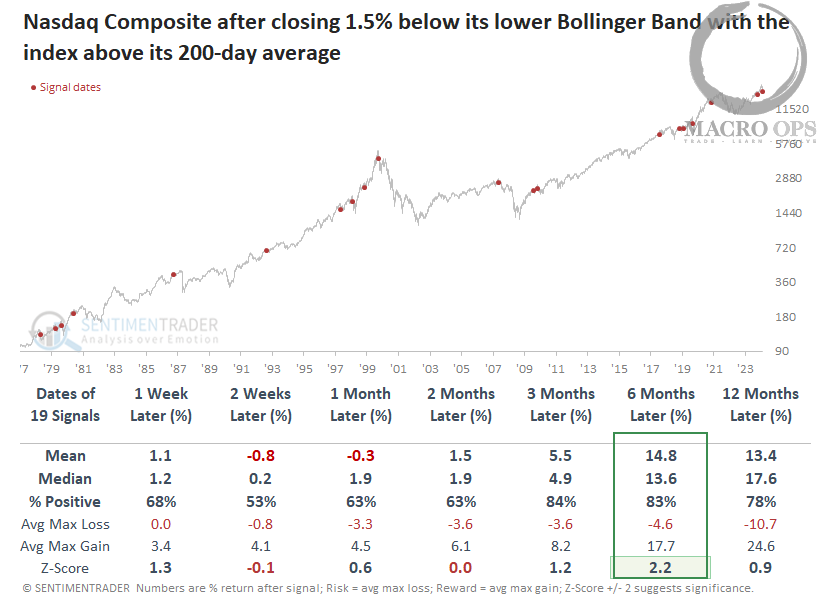 8. Not to be too gloomy, SentimenTrader shared these two charts pointing out that the Nasdaq was deeply oversold at over -1.5% below its lower Bollinger Band. And historically, this leads to strong returns over the longer run.