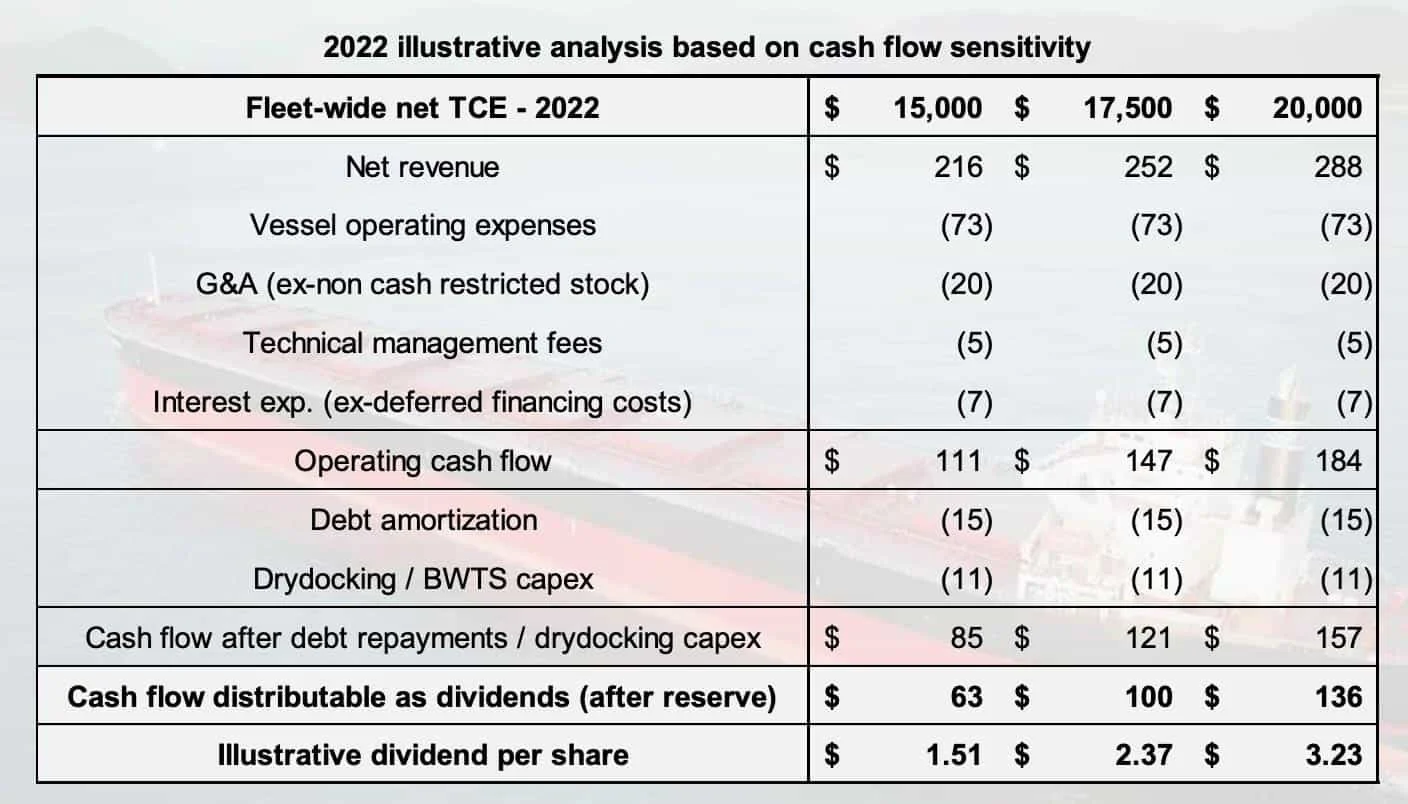 GNK is a dry bulk carrier that transports iron ore, coal, grains, steel products, and other dry-bulk cargoes. It charters its vessels primarily to trading houses, including commodities traders,, producers; and government-owned entities. Like the two tankers above, let’s focus on TCE rates and breakevens. GNK is living in its highest TCE rate environment since 2010. The company has ~74% of its Q2 2022 rates fixed at ~$20.7K. Moreover, its Major Bulk vessels are doing $25K per day! According to GNK’s latest investor presentation, each $1,000 increase in TCE adds ~$14M in EBITDA to the bottom line. The company plans to do three things with this potential increased cash flow: