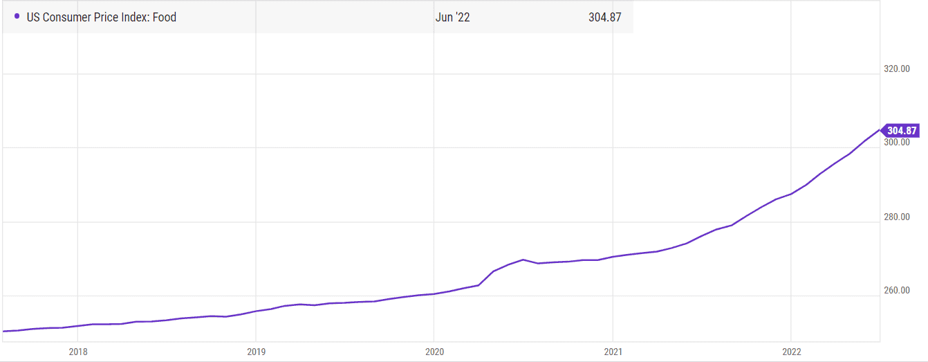 Similarly, we can observe a rapid increase in food prices in the US. In June ‘21, the index was at 276, while presently, it’s at 305, which is a 10% or so increase in food prices YoY!You can observe this in the chart below: