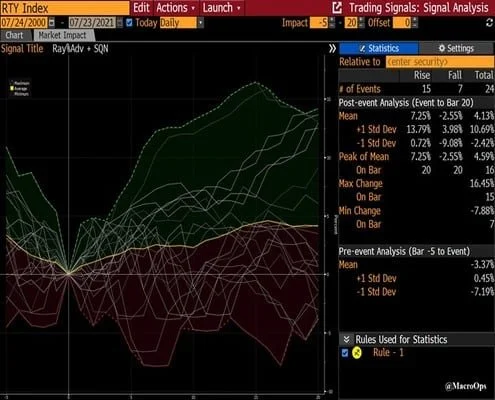 - Interestingly, this tends to be a positive signal. Out of 22 instances, 68% saw positive returns over the following 20 trading days with an average return of 7.25%.