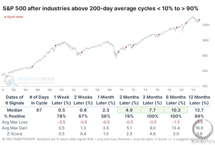 - But, as we’ve been writing since October, things have been starting to become less bad. Here’s a chart showing the Industry Breadth (% > 200-day avg) back above 90% (chart from SentimenTrader).