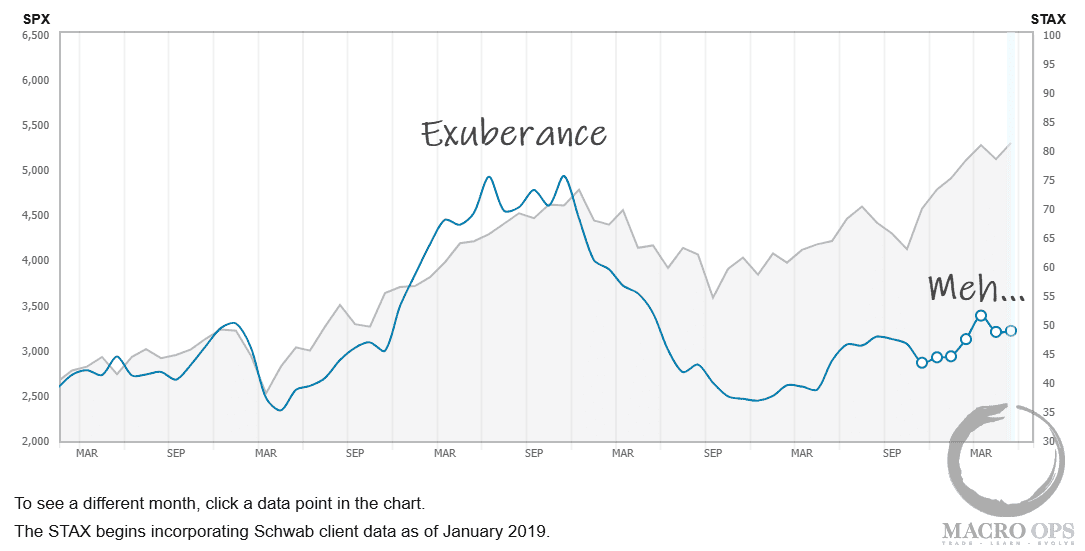 7. Schwab’s STAX index, which replaced TD Ameritrade’s IMX following their merger, is a monthly sentiment/positioning indicator based on the activity of millions of retail investor accounts. The index climbed as high as 77 in 21’ but sits now at only 48, showing a lack of the type of exuberance that tends to mark large tops.