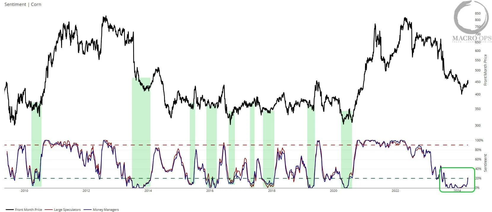 11. Our Sentiment oscillator shows there’s a strong bearish consensus in corn. Green highlights mark past instances where sentiment was this low. This is what major bottoms are made of.