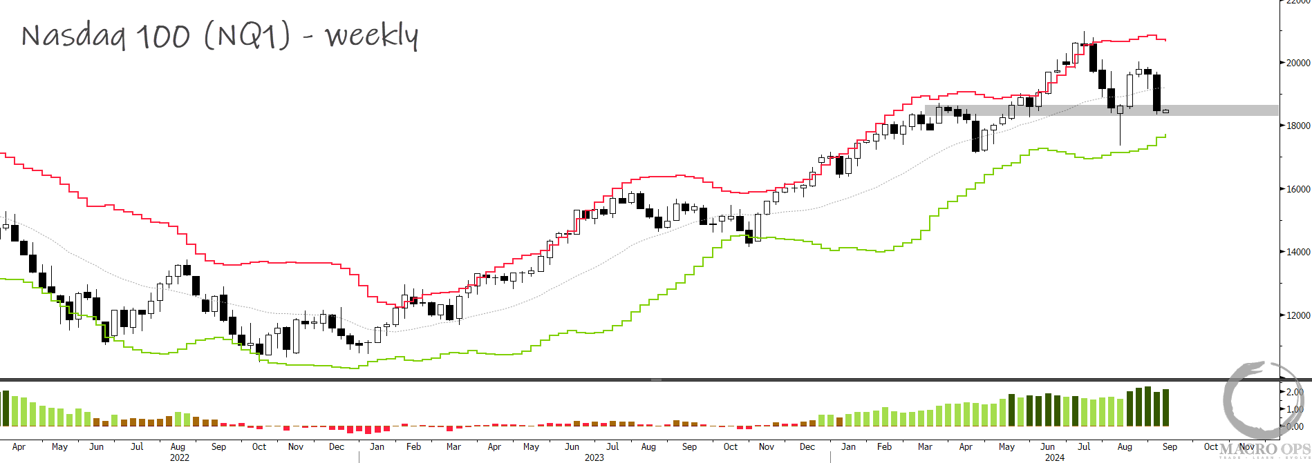 2. The primary trend is still up but short-term signals suggest more chop and vol ahead. It’ll be telling whether Qs hold this level or trade all the way down to their lower weekly band.
