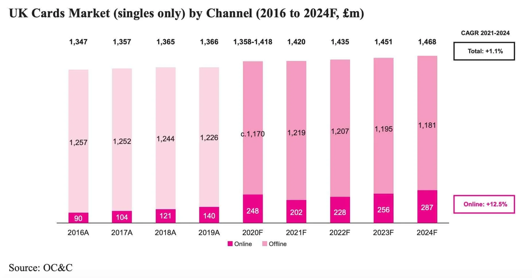 The card market is moving online. From 2016 – 2019 the online cards market grew 1.3x faster than online cosmetics & toiletries, 1.8x more quickly than online homewares, and 1.6x faster than online clothing. Despite this growth, online sales represent only 10% of the total card market.Over the next few years, online sales should grow at 12.5% CAGR and command ~20% of the card market (12x the 1.1% average annual growth for the total card market).