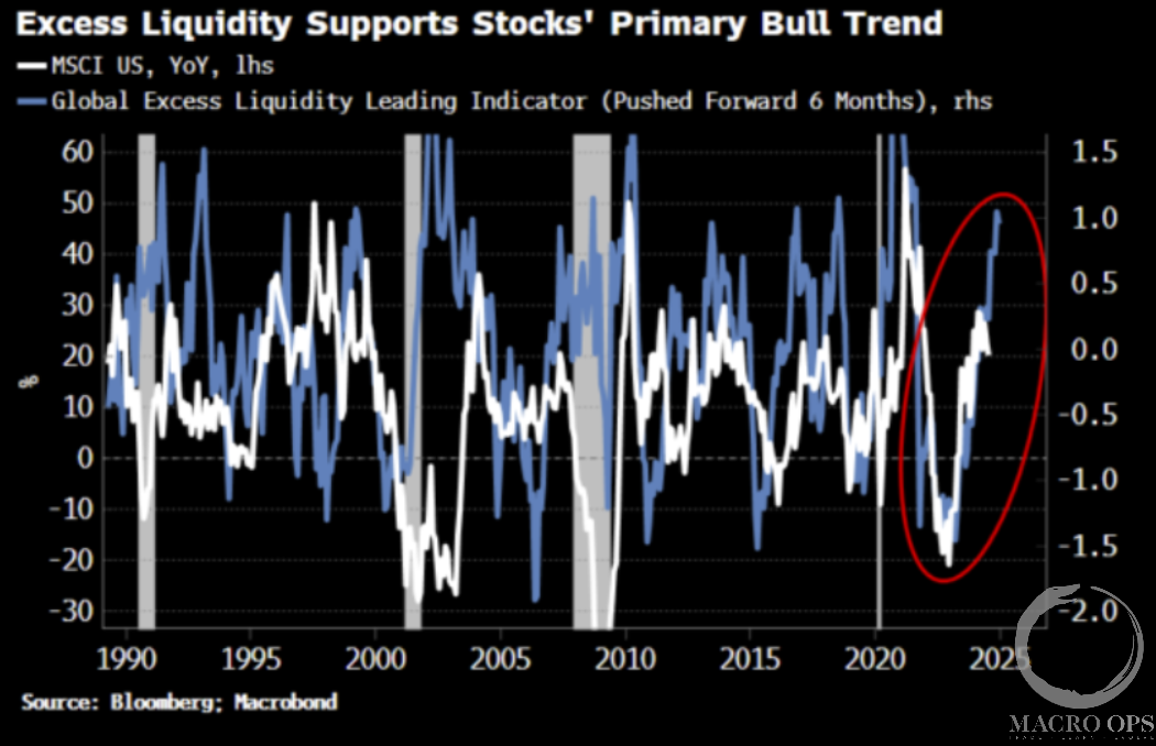 6. BBG’s Simon White notes that Global Excess Liquidity (blue line pushed forward 6m) remains supportive of risk assets.