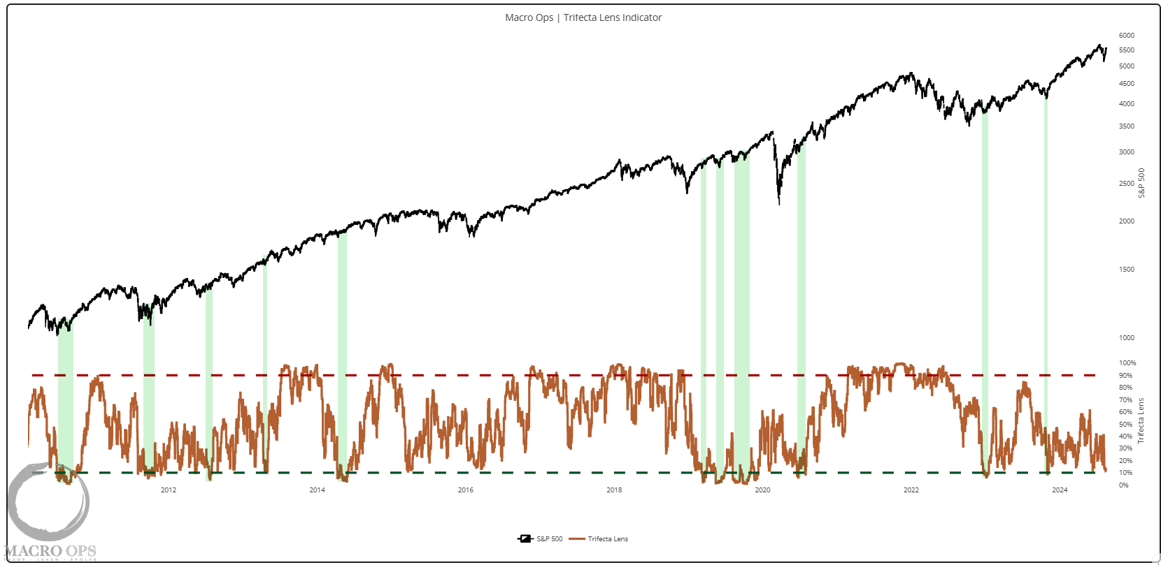1. Our Trifecta Lens indicator, a composite of macro, technical, and sentiment/positioning intermediate data points, has fallen to 11%. A buy signal is triggered when this dips below 10%. See green highlights for past sections.