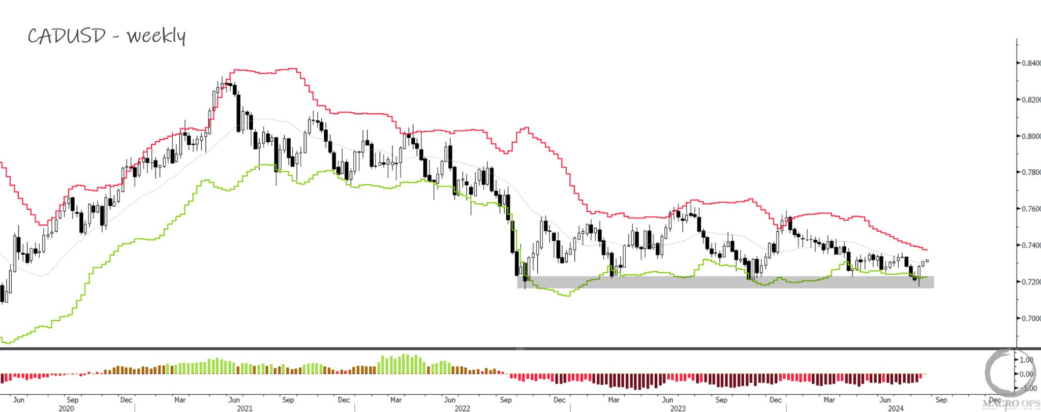 8. We’ve been highlighting the major ongoing compression regime in CADUSD for months as well as a handful of other USD pairs. This chart is a weekly. The shaded area looks like a firm floor on the pair.