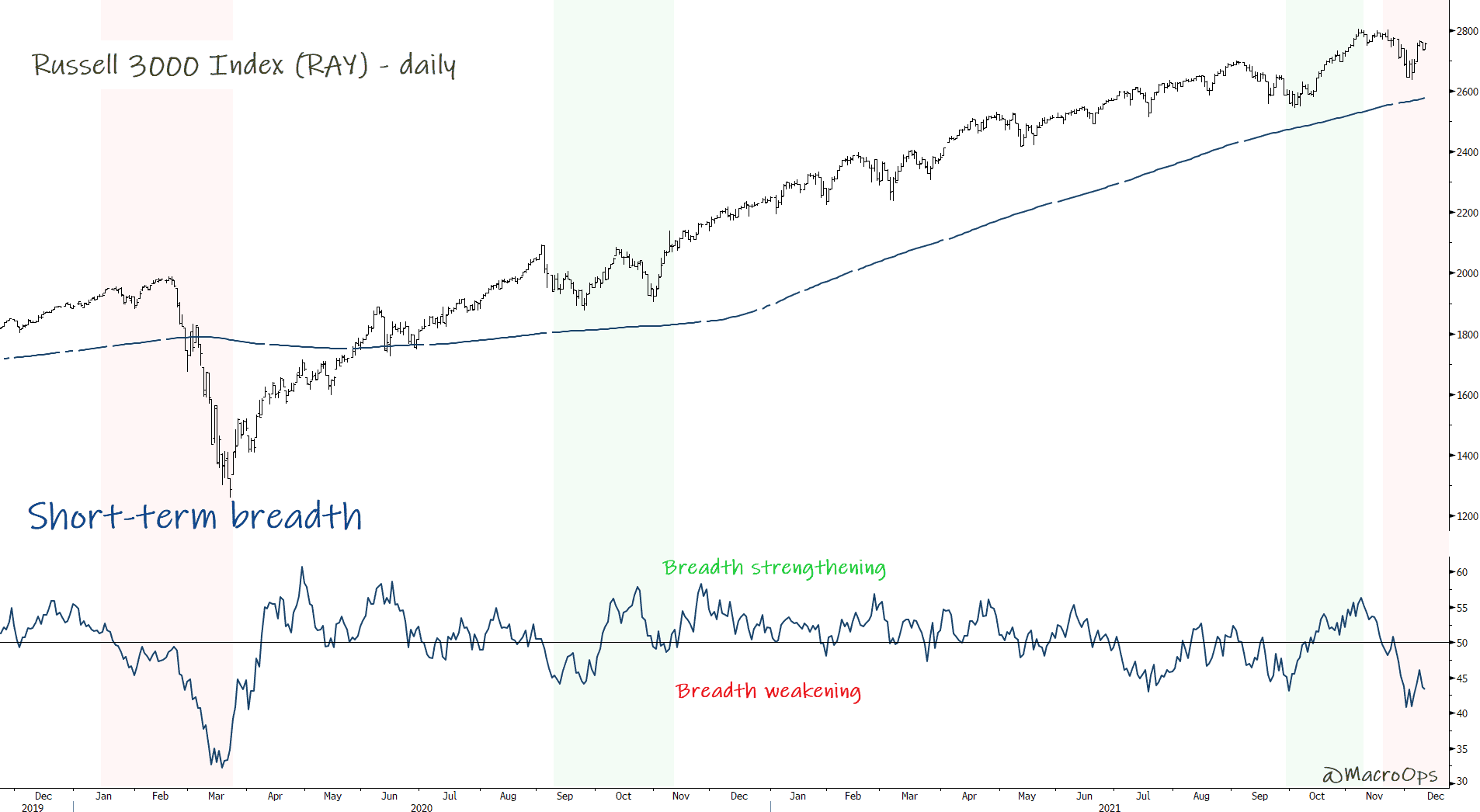 The % or Russell 3000 stocks trading below their 50-days fell below 25% last week. Oversold breadth conditions around this level tend to mark bottoms in healthy uptrends.