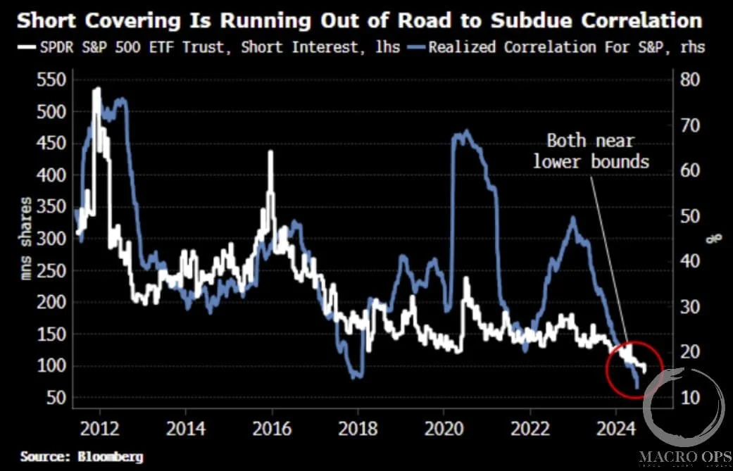 5. BBG’s Simon White shared these two charts of caution which are worth filing away. The first shows that both the cboe’s 1-year S&P implied correlation index (white) and 1-year realized correlation for the S&P (blue) are plumbing new lows, with similar action last seen in the lead-up to the 18’ “Volmageddon” event.