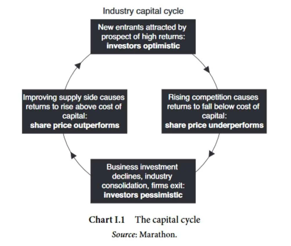The debt cycles’ effects on the supply side are explained by Marathon Asset Management’s “Capital Cycle” approach in their excellent investment book Capital Returns authored by Edward Chancellor. Here’s a stylized example from the book of the Capital Cycle at work: