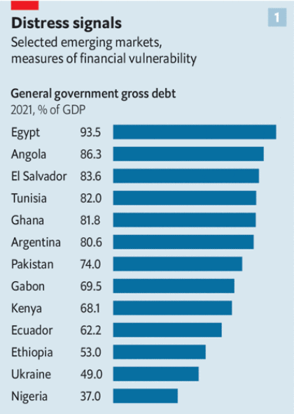 “The combination of heavy debt burdens, slowing global growth, and tightening financial conditions will be more than some governments can bear. One set of potential victims comprises the poorest economies, which have been less able to borrow in relatively safe ways—in their own currencies, for example—and which, because of the pandemic, were already vulnerable. Among 73 low-income countries eligible for debt relief under a g20 initiative, eight carry public-debt loads, which the imf has deemed to be unsustainable, and another 30 are at high risk of falling into such a situation. Debt problems in these countries pose little threat to the global economy; together, their GDP is roughly equivalent to that of Belgium. Yet they are home to nearly 500m people, whose fates depend on whether their governments can afford to invest in basic infrastructure and public services.”