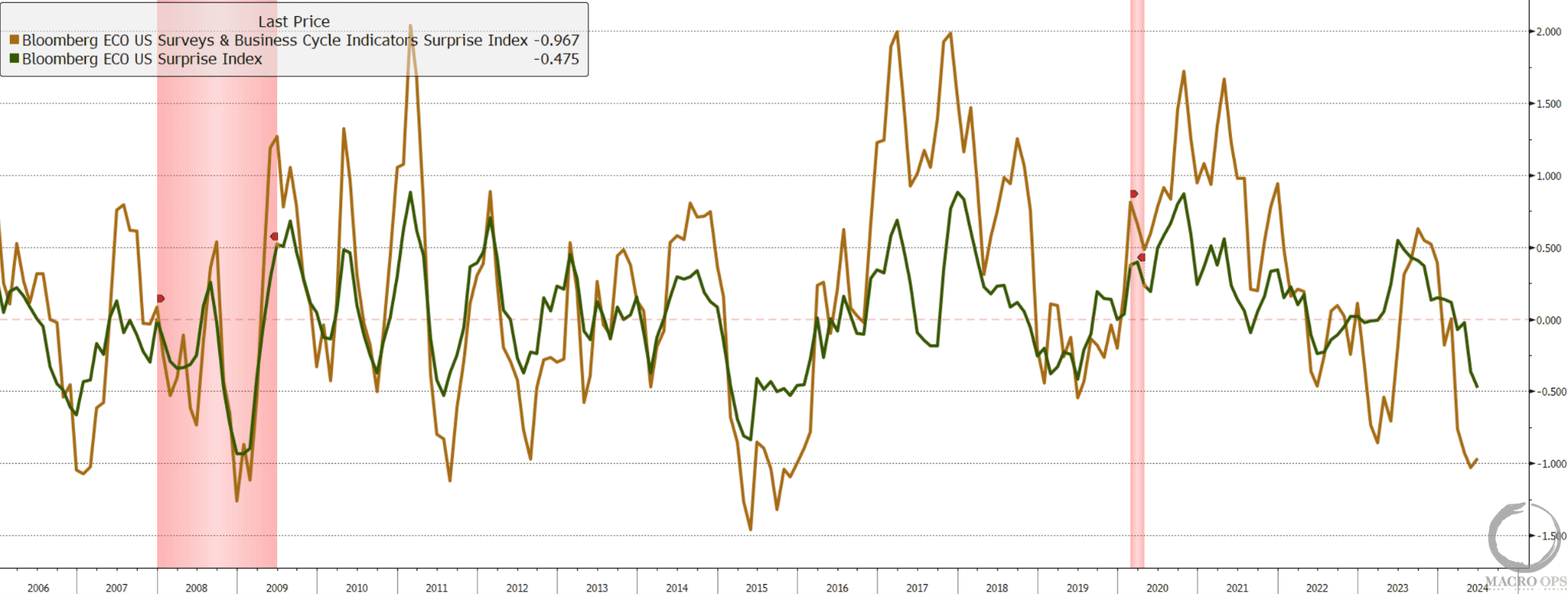 2. At the same time, we’re starting to see increasing weakness in the labor market and signs of slowing growth in the economy. We’ve seen a trend of negative economic surprises since the start of the year, which are now at their most bearish levels since 2015 (BBG Business cycle surprise index in tan & economic surprise index in green).