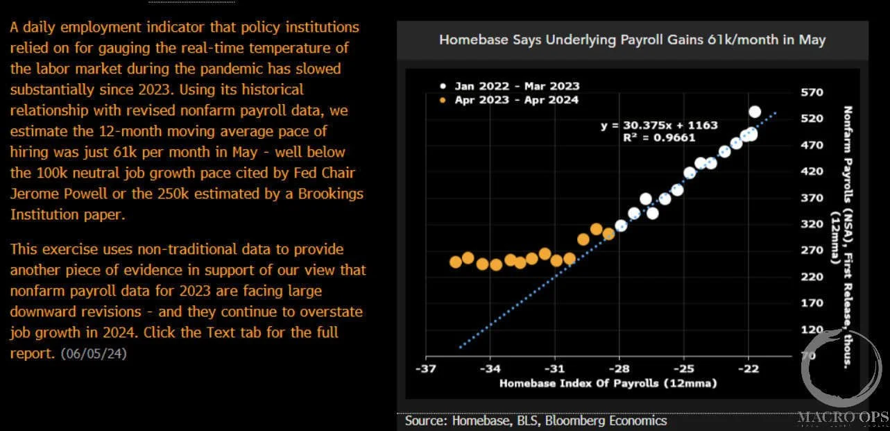 3. BBG used data from Homebase, a small business payroll company, to show that the establishment non-farm payroll numbers have been grossly overstating jobs due to an error in their business birth/death assumptions. BBG estimates that “the 12-month moving average pace of hiring was just 61k per month in May – well below the 100k neutral job growth pace cited by Fed Chair Jerome Powell or the 250k estimated by a Brookings institution paper.”