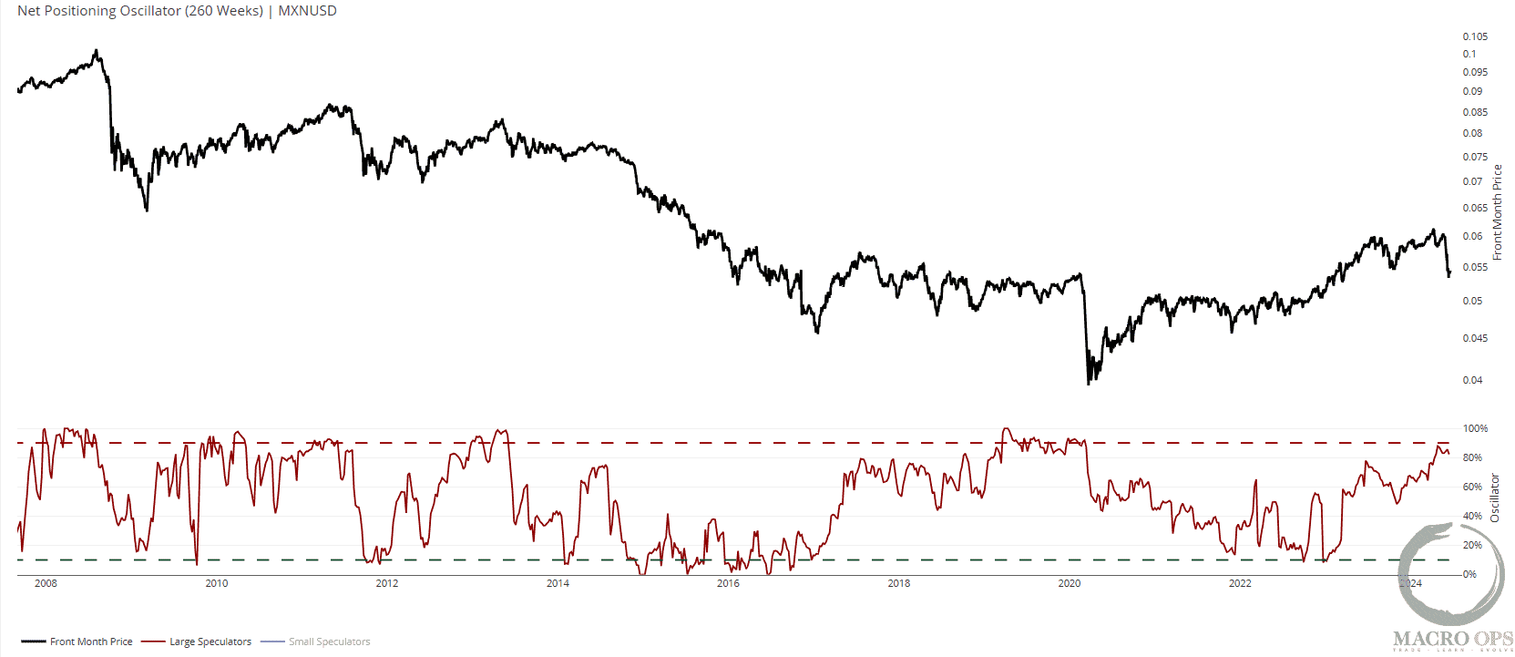 12. Large specs are near the 90th percentile of their 5-year average, showing the MXN bulls have crowded onto one side of the boat.