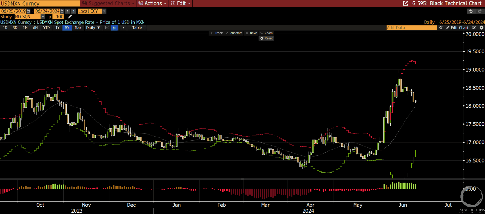 11. The Mexican peso dropped against the dollar following Claudia Sheinbaum’s victory in the country’s presidential race. We’re interested in playing this to the long side if we see a technical reversal around its BB midline. Long USDMXN is a good way to hedge in the event we enter a period of risk-off.