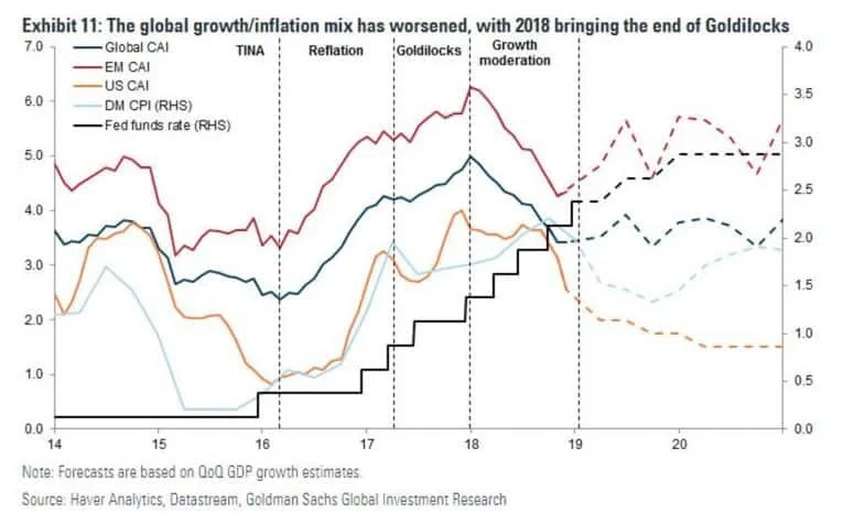 Adam gives the following example of how the vol tax plays out in reality. He writes, “Emerging market stocks had an average annual return of 10.6% from 1992 to 2018, at first glance outpacing the 10.5% average return of US stocks. Yet the compound return of emerging market stocks was only 4.6%, meaning they actually underperformed less risky assets like government bonds.” That’s quite a difference. Here’s the link to the piece, it’s certainly worth a read. And he cites a paper by Mark Spitznagel on the subject, which you can find here. Next, give this post by Chris Mayer a quick read. It’s a good write-up on hundred baggers and ‘coffee can’ stocks. Here’s the link.Lastly, if you want to read an ultra-bearish, yet still thoughtful, take on the markets then give this report a read. It’s by James Montier of GMO and serves as some good food for thought. Charts — @Robbinwigg (editor of US markets for the FT) put out a chart storm on the twitter yesterday. There are some really interesting charts in there, definitely worth checking out (here’s the link). Here’s just one of them showing that the ‘Goldilocks’ period of moderate growth and slow inflation has come to an end.