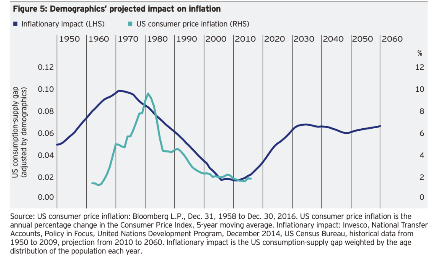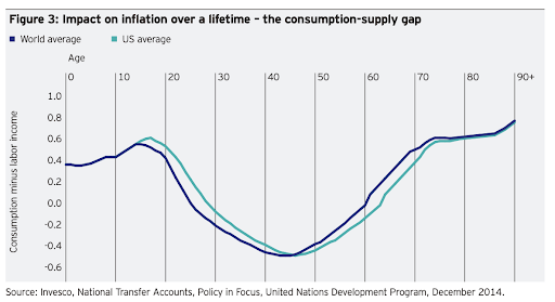 Secular it’s all about demographics and what’s called the consumption-supply gap. Many wrongly assume that an aging demographic is deflationary, but that’s not true. An individual imparts an inflationary force twice during their lifetime. The first is during childhood when consumption exceeds labor and then during retirement. A higher consumption/supply gap has a greater inflationary impact, via wages, and vice-versa (see charts below).