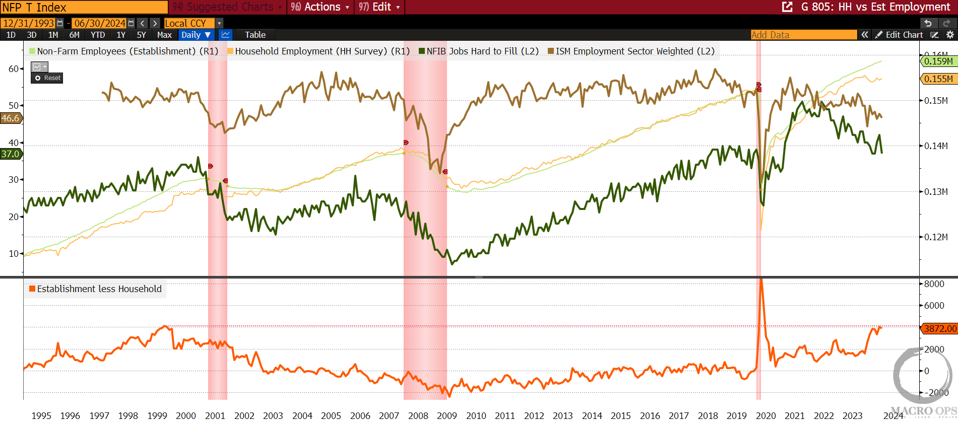 While the Household survey has shown a clearly weakening labor market. For example, the establishment survey says we’ve seen over 1 million jobs created since the start of the year. While the household survey shows a decrease of over 100k jobs since Jan 1st.