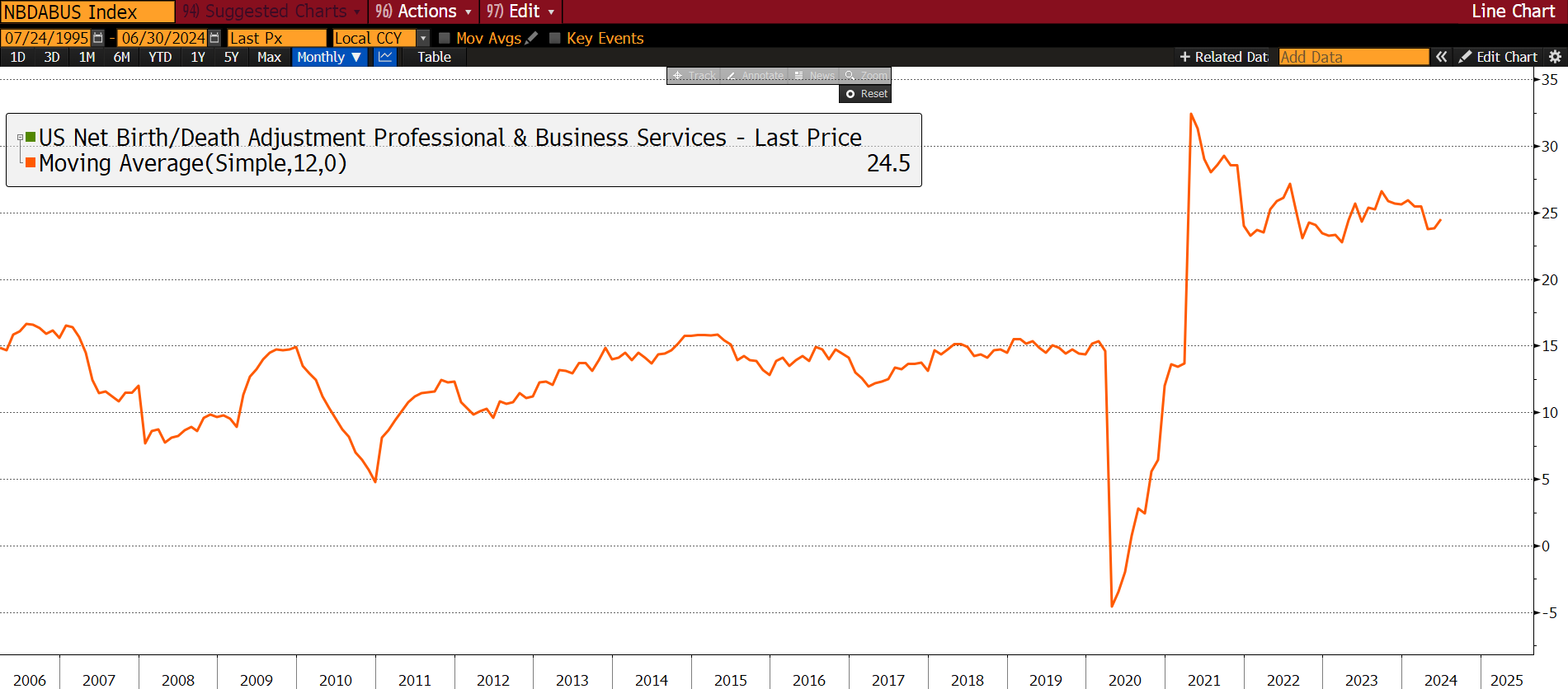 “Making proper adjustments, we think… the 12-month moving average pace of hiring was just 61k per month in May – well below the 100k neutral job growth pace cited by Fed Chair Jerome Powell or the 250k estimated by a Brookings institution paper.”