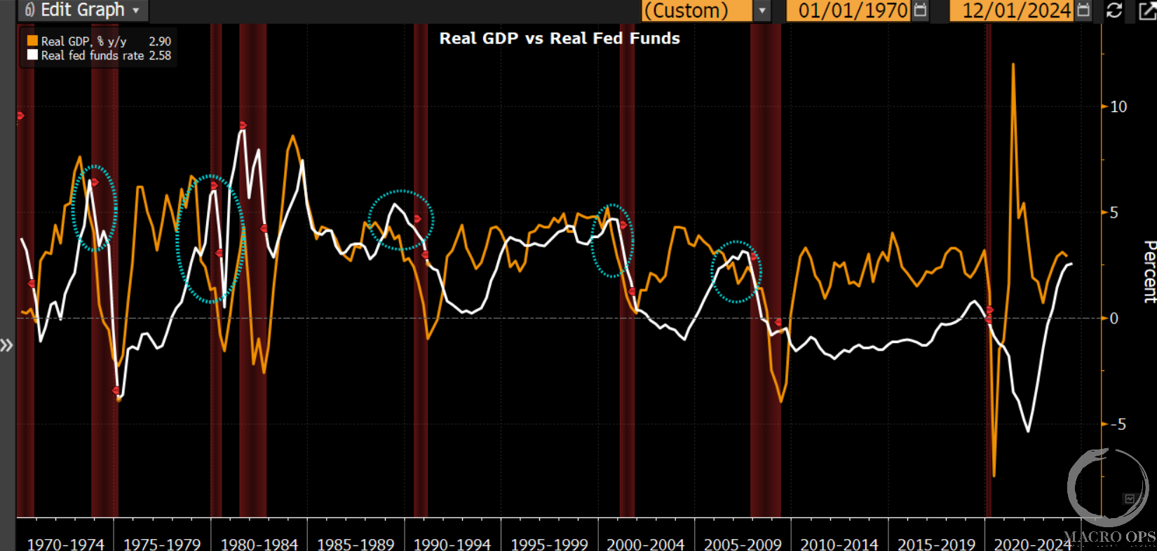 Simply put, monetary policy is too tight. We can see in our chart below that Real GDP (orange line) is about to cross below the Real Fed Funds rate (white line). When that happens it’s a good barometer of Fed policy that’s chucking sand into the gears of the economy and why past instances have tended to precede a recession.