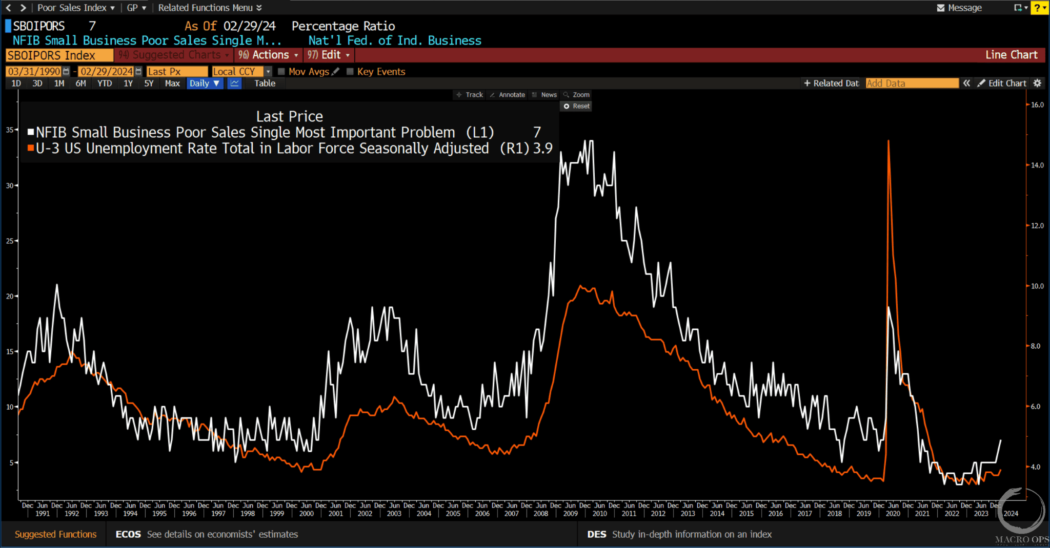 We can see this discrepancy clearly in the chart below. The bottom orange line shows the establishment numbers minus the households is at a level seen only twice, during the COVID recession and the top of the 2000 tech bubble.