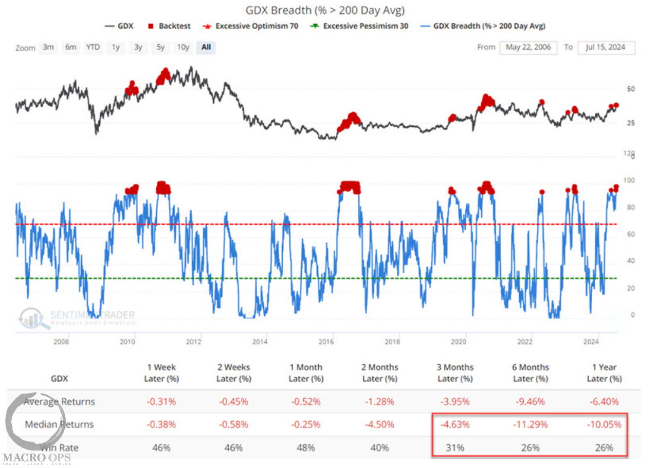 12. SentimenTrader also recently pointed out that the percentage of GDX members above their 200-day average is quite high and at levels that in the past have preceded weak returns out to a year later.