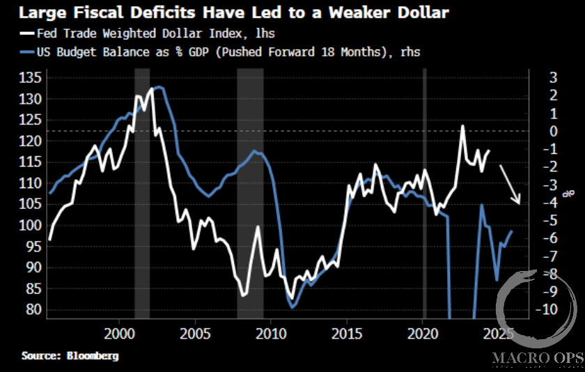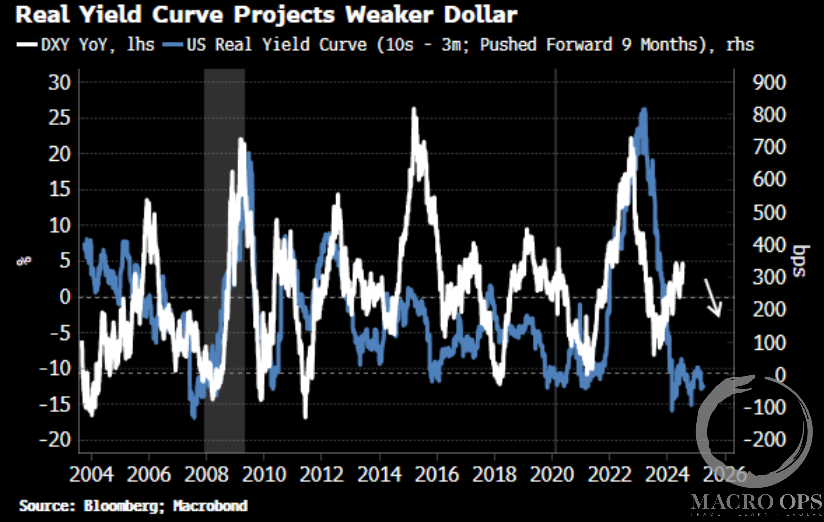 7. BBG’s Simon White put out some interesting charts arguing the USD bear case. He writes “This curve is one of the top (and very few) shorter-term leading indicators for the dollar, with it currently indicating the US currency is likely to see downside in the nearer term(6-9 months).”