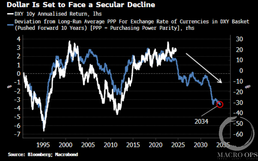 8. White continues “Almost every currency in the DXY basket is undervalued on a purchasing power parity (PPP) basis versus the dollar, especially the euro and the yen, Currencies do not typically remain persistently over or undervalued and instead gravitate toward their fair value. As the chart below shows, that translates into a secular weakening of the dollar over the next decade.”