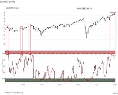 - Our aggregate sentiment and positioning indicator is coming off a 90th percentile reading. This denotes significant trend fragility. Our shorter-term indicators suggest the path of least resistance is still up but the market is likely to hit a speed bump in the second half of this month. Watch the tape and keep yo eyes peeled!