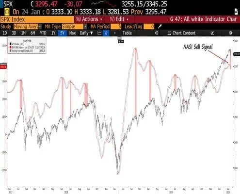 1. The McClellan Summation index (NASI) triggered a sell signal on Friday. Highlighted red zones mark past occurrences.