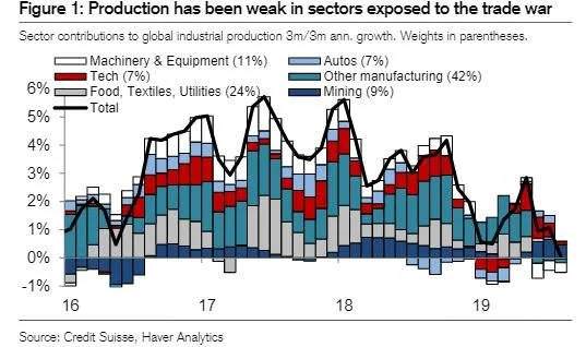 - And with tariffs set to rise substantially going into the end of the year, the trade war sure isn’t helping things (chart via Credit Suisse).